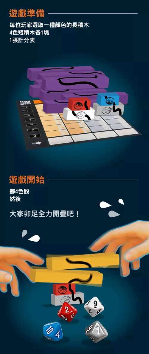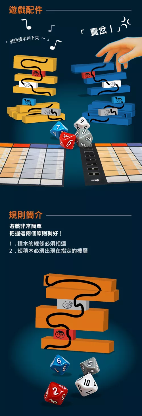 當積木加入桌遊元素,有了條件限制,有了隨機變數,有了超越極限的決心,完成挑戰後,你和你的朋友就有了自豪的歡笑!