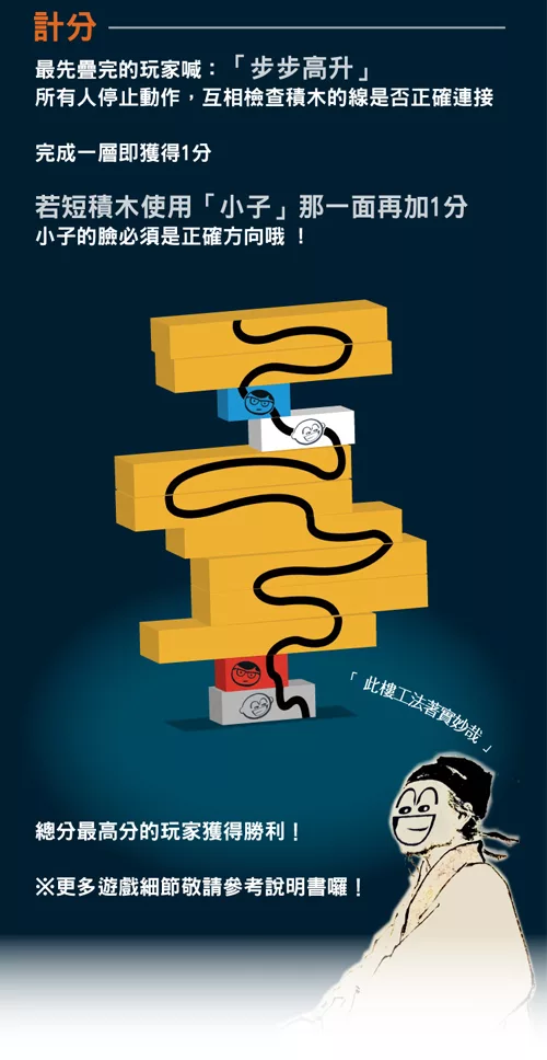 完成一層即獲得1分 ,若短積木使用「小子」那一面再加1分 ,小子的臉必須是正確方向哦!